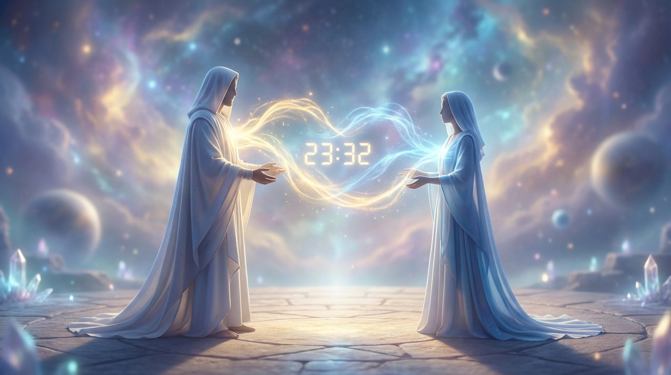 Regardez le chiffre 2, présent ici à deux reprises. Il ne fait pas de la figuration : il incarne la dualité brute, le partenariat et la coopération nécessaire. Pour les 23h32 : Signification de l’Heure Miroir pour les Flammes Jumelles, c’est le symbole de l’union par excellence.